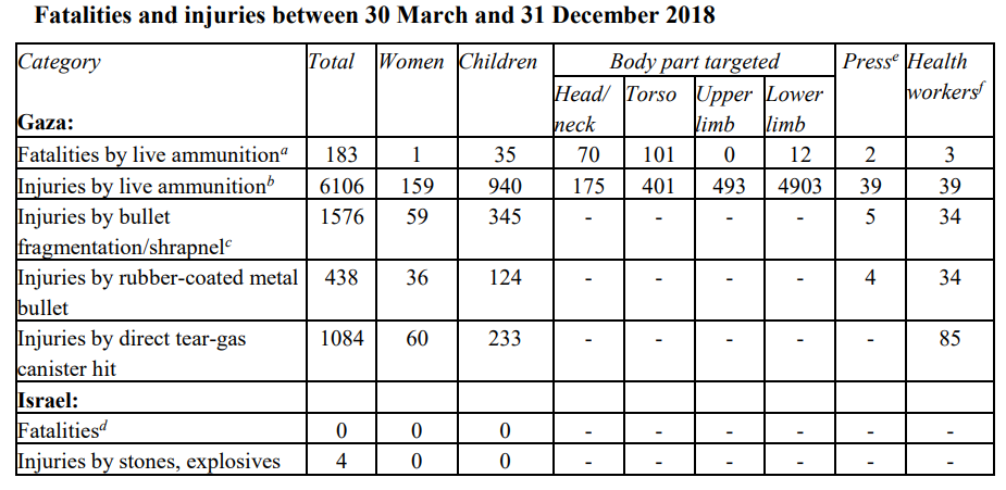 UN OHCHR (2019) A/HRC/40/74: “Report of the independent international commission of Inquiry on the protests in the Occupied Palestinian Territory” (during the Great March of Return). Notice that 189 Palestinians and 0 Israelis were killed. I wonder what the instructions on the IDF forces were.